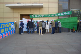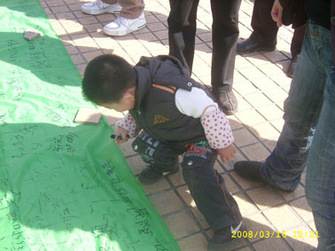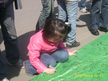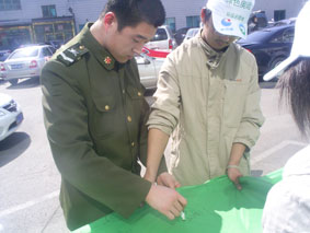 3月16日,為倡議有車族參與本活動(dòng),加強(qiáng)對(duì)廢油液排放的監(jiān)督,來(lái)自?shī)W吉娜、東北大學(xué)、沈陽(yáng)大學(xué)、中國(guó)醫(yī)大的環(huán)保志愿者組成了近千人的宣傳隊(duì),在桃仙機(jī)場(chǎng)、北方圖書(shū)城、卓展商場(chǎng)、每家瑪、家樂(lè)福金牛店、麥德龍展開(kāi)了宣傳。上午10時(shí),活動(dòng)現(xiàn)場(chǎng)設(shè)置了“支持回收車用廢棄油液-利國(guó)利民利已利后世”條幅和巨幅“迎奧運(yùn)天藍(lán)水清地綠-車用廢棄油液回收活動(dòng)之沈城十萬(wàn)駕車者聯(lián)合簽名”錦旗,志愿者現(xiàn)場(chǎng)講解車用油液對(duì)環(huán)保的危害,倡議有車人士對(duì)隨意排放現(xiàn)象進(jìn)行監(jiān)督。活動(dòng)得到有車族的積極響應(yīng)與大力支持,不到半天,已有近萬(wàn)名應(yīng)倡者在錦旗上簽名,從中可以看出沈陽(yáng)市民迎接奧運(yùn)的熱情和對(duì)和諧社會(huì)的向往,體現(xiàn)了沈陽(yáng)市民普遍具有較強(qiáng)的環(huán)保意識(shí)和責(zé)任感。