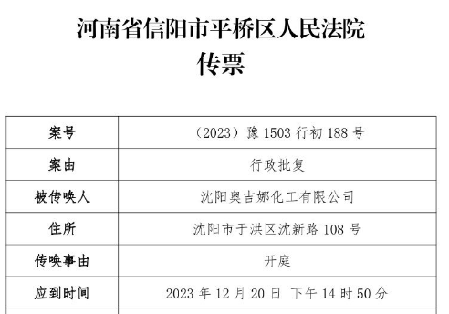 2023年12月1日,沈陽奧吉娜化工有限公司(下簡稱奧吉娜公司)收到河南省信陽市平橋區人民法院開庭傳票,奧吉娜公司訴信陽市生態環境局和第三人華陽長青投資有限公司行政訴訟案,將于2023年12月20日14時50分開庭審理。屆時,這起風電潤滑油央企招投標“民告官”第一案結果如何,讓我們拭目以待,敬請關注!
