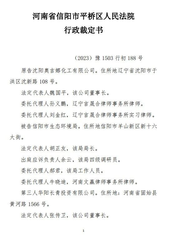 中國(guó)風(fēng)電潤(rùn)滑油民營(yíng)企業(yè)沈陽(yáng)奧吉娜化工有限公司(下簡(jiǎn)稱:奧吉娜公司或原告)訴信陽(yáng)市生態(tài)環(huán)境局(被告)和第三人華陽(yáng)長(zhǎng)青投資有限公司(下簡(jiǎn)稱:華陽(yáng)長(zhǎng)青公司)行政訴訟案,河南省信陽(yáng)市平橋區(qū)人民法院于2023年12月29日作出行政裁定:駁回原告沈陽(yáng)奧吉娜化工有限公司的起訴。