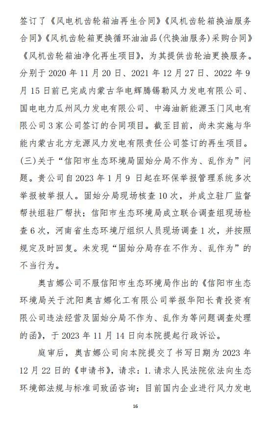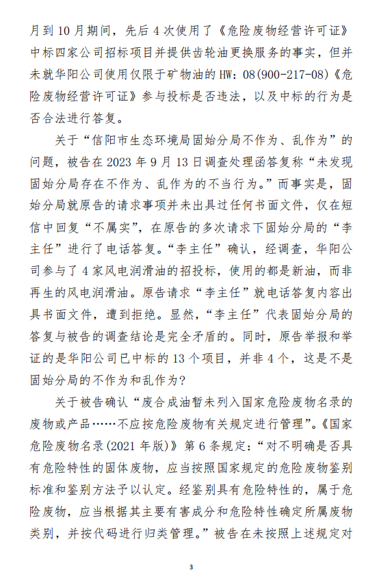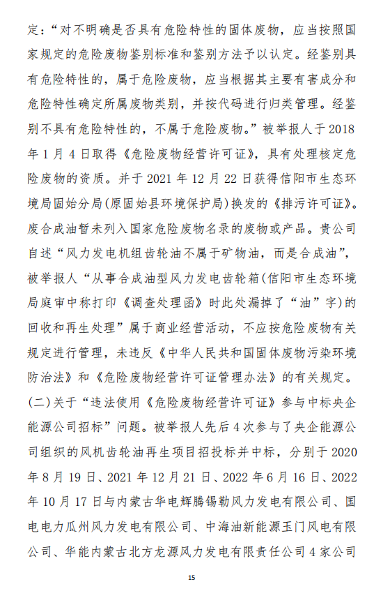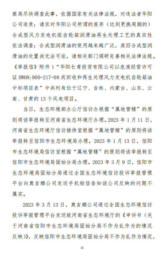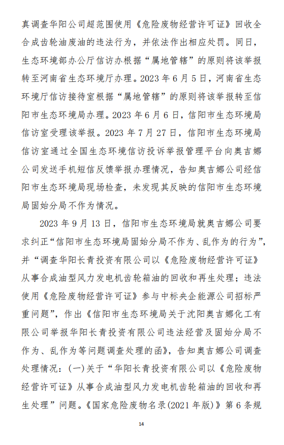 2023年9月13日,信陽(yáng)環(huán)境局向奧吉娜公司致《信陽(yáng)市生態(tài)環(huán)境局關(guān)于沈陽(yáng)奧吉娜化工有限公司舉報(bào)華陽(yáng)長(zhǎng)青投資有限公司違法經(jīng)營(yíng)及固始分局不作為、亂作為等問(wèn)題調(diào)查處理的函》。函中:一是,以“齒輪箱”替換“齒輪箱油”,偷換概念;二是,做出了廢風(fēng)電合成(齒輪)油不屬于危險(xiǎn)廢物的結(jié)論;三是,未發(fā)現(xiàn)固始分局存在不作為、亂作為的不當(dāng)行為。再次否定奧吉娜公司的舉報(bào)和投訴。