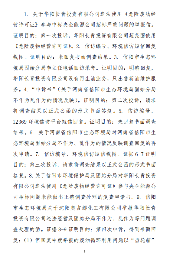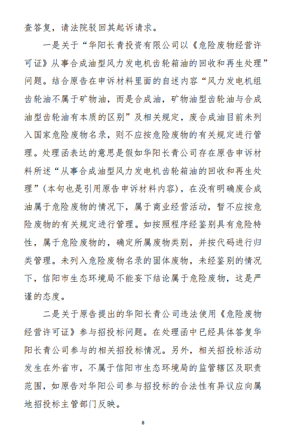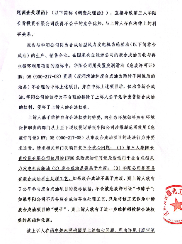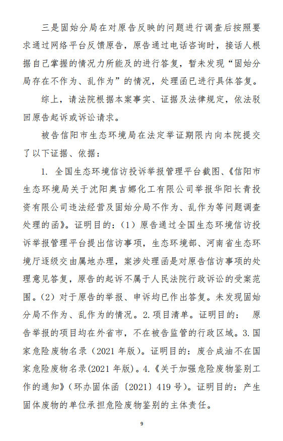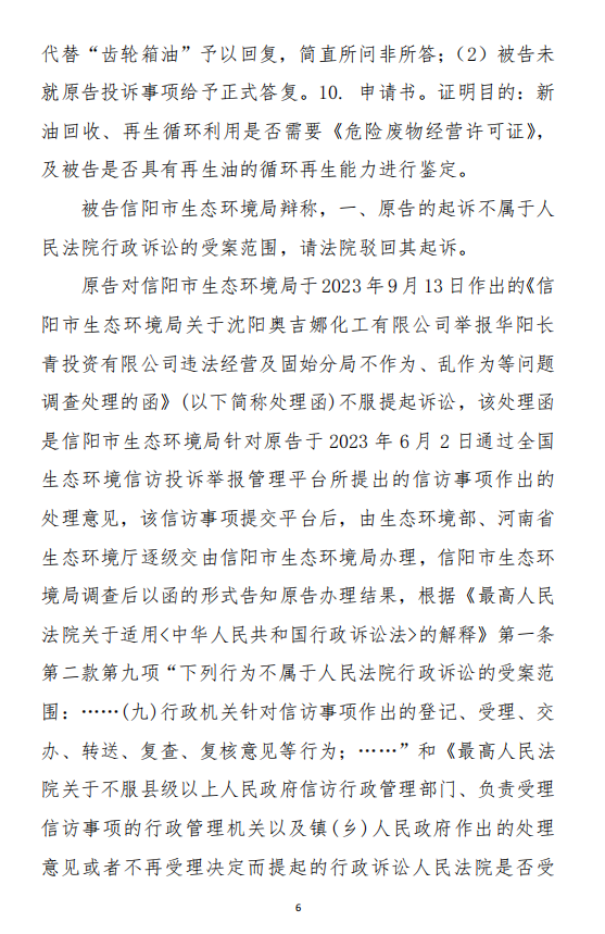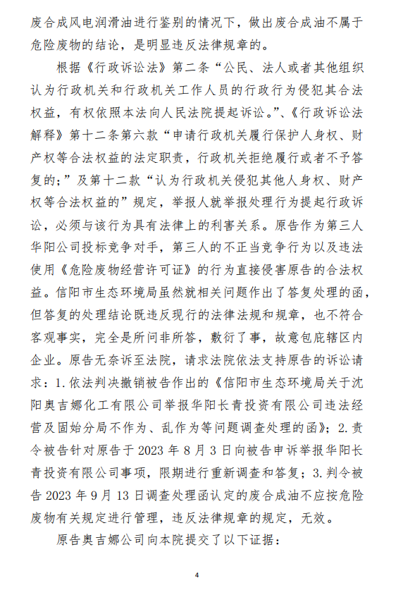 2、訴訟請(qǐng)求:請(qǐng)求人民法院判決撤銷被告作出的《信陽(yáng)市生態(tài)環(huán)境局關(guān)于沈陽(yáng)奧吉娜化工有限公司舉報(bào)華陽(yáng)長(zhǎng)青投資有限公司違法經(jīng)營(yíng)及固始分局不作為、亂作為等問(wèn)題調(diào)查處理的函》;責(zé)令被告對(duì)原告向被告舉報(bào)華陽(yáng)長(zhǎng)青投資有限公司事項(xiàng),限期進(jìn)行重新調(diào)查和答復(fù);判令被告認(rèn)定的廢合成油不應(yīng)按危險(xiǎn)廢物有關(guān)規(guī)定進(jìn)行管理違反法律規(guī)章規(guī)定,無(wú)效。