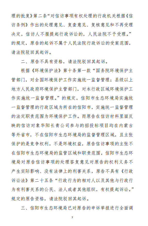 法院的裁定理由是:被告的《信陽(yáng)市生態(tài)環(huán)境局關(guān)于沈陽(yáng)奧吉娜化工有限公司舉報(bào)華陽(yáng)長(zhǎng)青投資有限公司違法經(jīng)營(yíng)及固始分局不作為、亂作為的問(wèn)題調(diào)查處理函》(下稱《調(diào)查處理函》)與原告訴請(qǐng)沒(méi)有利害關(guān)系,因此,原告沒(méi)有訴訟資格,下附一:《河南省信陽(yáng)市平橋區(qū)人民法院行政裁定書(shū)》(18頁(yè))。