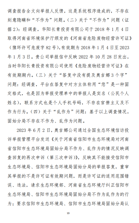 2023年6月13日,奧吉娜公司再次向環(huán)境部提出申訴,指出,奧吉娜舉報(bào)的不是許可證有效期問(wèn)題,而是許可證的適用范圍錯(cuò)誤、違法。2023年7月27日,奧吉娜公司收到回復(fù)稱,經(jīng)信陽(yáng)市生態(tài)環(huán)境局現(xiàn)場(chǎng)檢查,未發(fā)現(xiàn)固始分局不作為情況。