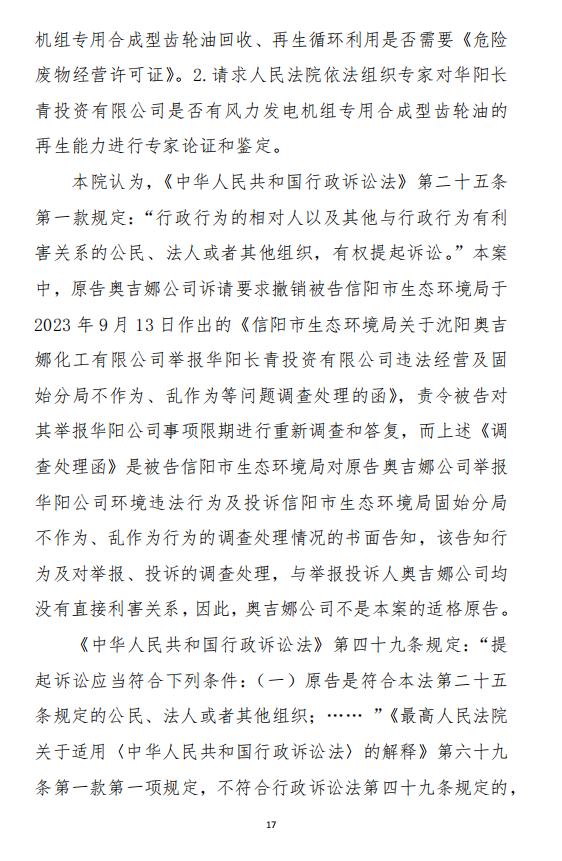 2023年10月18日,奧吉娜公司依據(jù)《行政訴訟法》和《行政訴訟法解釋》,將信陽(yáng)市環(huán)境局和第三人華陽(yáng)長(zhǎng)青公司訴至信陽(yáng)市平橋區(qū)人民法院,請(qǐng)求法院:1、判決撤銷被告作出的《信陽(yáng)市生態(tài)環(huán)境局關(guān)于沈陽(yáng)奧吉娜化工有限公司舉報(bào)華陽(yáng)長(zhǎng)青投資有限公司違法經(jīng)營(yíng)及固始分局不作為、亂作為等問(wèn)題調(diào)查處理的函》;2、責(zé)令被告針對(duì)原告于2023年8月3日向被告申訴舉報(bào)華陽(yáng)長(zhǎng)青投資有限公司事項(xiàng),限期進(jìn)行重新調(diào)查和答復(fù);3、請(qǐng)求人民法院判令被告2023年9月13日調(diào)查處理函認(rèn)定的廢合成油不應(yīng)按危險(xiǎn)廢物有關(guān)規(guī)定進(jìn)行管理,違反法律規(guī)章的規(guī)定,無(wú)效。