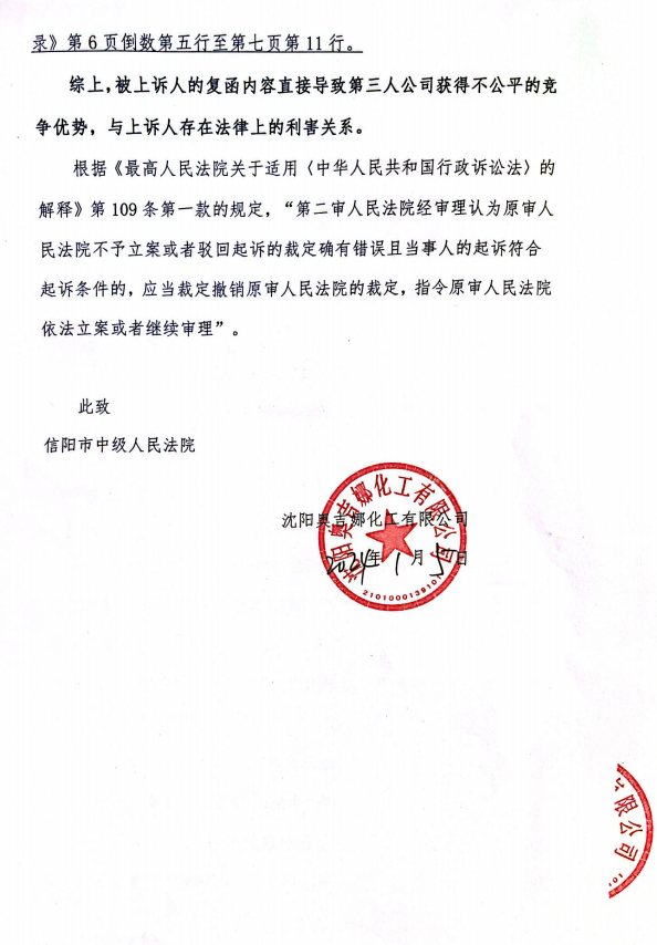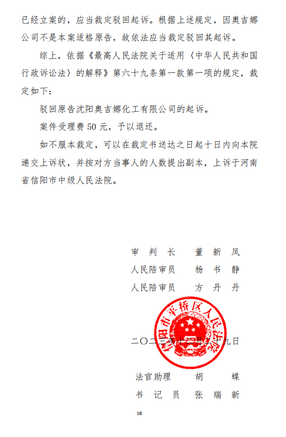 2023年12月29日,河南省信陽(yáng)市平橋區(qū)人民法院裁定:駁回原告沈陽(yáng)奧吉娜化工有限公司的起訴。