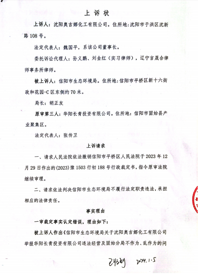 2024年1月5日,沈陽(yáng)奧吉娜公司不服河南省信陽(yáng)市平橋區(qū)人民法院的裁定,上訴至河南省信陽(yáng)市中級(jí)人民法院。