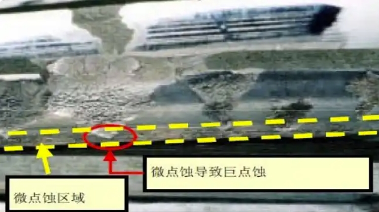 微點蝕,又稱“灰斑”,普遍存在于齒輪副表面,是一種表面疲勞并伴有材料脫落的磨損形式。顯微鏡下觀察,會看到密密麻麻成片的小坑或微小裂紋。盡管微點蝕不是一個新現象,由于微點蝕導致設備失效是一個較漫長的過程,所以人們對微點蝕的危害性認識不足。因風電機組運行環境惡劣,常年經受變風向、變負荷作用,頻繁出現微點蝕從而導致風機齒輪箱失效,所以在風電機組運行維護的過程中,風機齒輪的微點蝕問題日益突出。風電機組中微點蝕主要發生在低速重載齒輪面上,在齒面嚙合過程中,在較高的接觸應力和相對摩擦作用下,導致齒面局部溫度升高,潤滑油膜破裂,齒面間的潤滑方式呈邊界潤滑狀態,使得兩齒面的波峰發生直接接觸,進而導致微點蝕。齒面表面一旦產生微點蝕,將降低風電機組齒輪組齒牙的精確度,增加動態負荷,進而造成噪音增加、振動加強,并增加齒輪疲勞失效的機會,嚴重時可導致點蝕、剝落甚至斷齒(見圖2)。