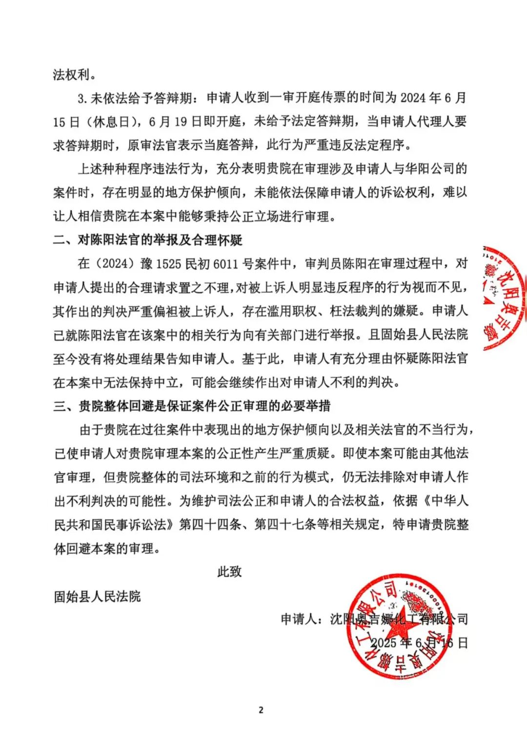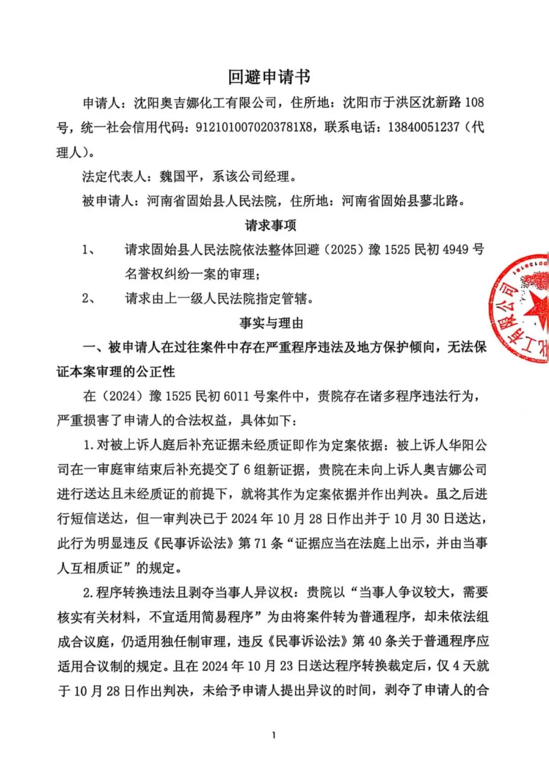 河南華陽長青起訴沈陽奧吉娜舉報案名譽侵權(quán)發(fā)回重審,奧吉娜基于原一審固始縣法院存在嚴重違法行為申請其全院回避!